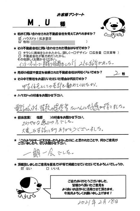 ご売却/U様 情報提供等に大変好感が持てました
