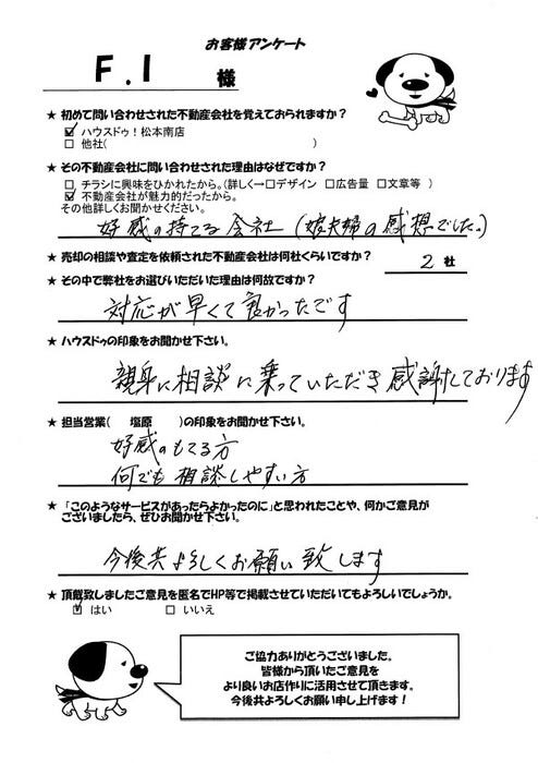 I様 この度は物件のご売却、誠におめでとうございます。主にやりとりはお嬢様とさせて頂きましたが、書類のやり取り等すぐにご対応頂き、大変感謝しております。引き続き、お力になれる様尽力して参りますので、どうぞよろしくお願い申し上げます。